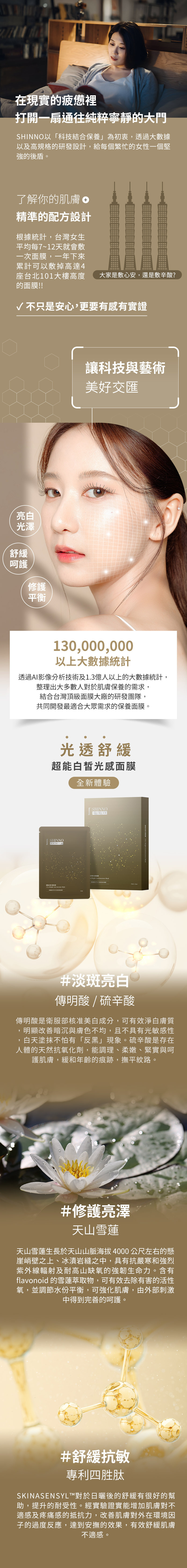 透過 SHINNO AI 分析超過 10 萬筆亞洲肌膚數據,結合佐研院國際獲獎配方,專為「暗沉、膚色不均、缺乏光澤」等常見膚況設計。
